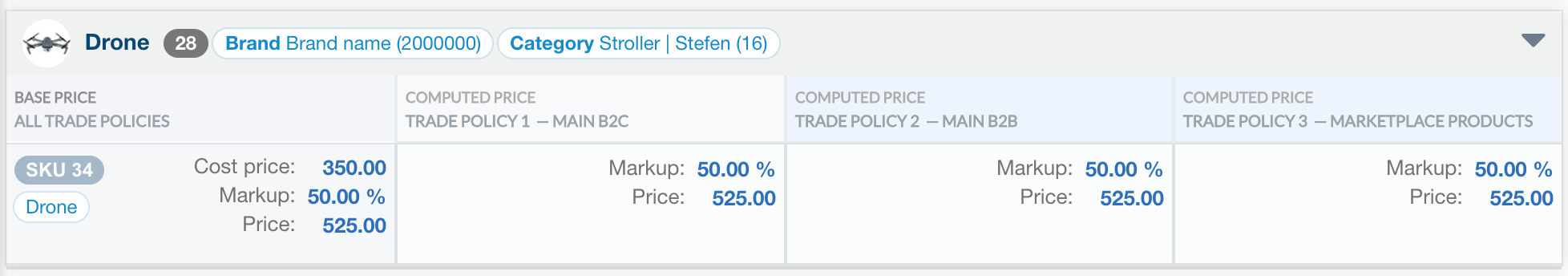 A SKU's base price is the value which results from merging the Cost Price with the Markup, the desired profit margin with the SKU's sale. It represents the SKU's reference price for all price tables.