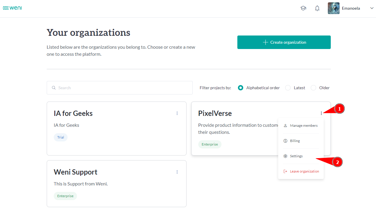 To add an extra layer of security to your organization's projects and data, you can enable two-factor authentication (2FA) for all users. This ensures that only users with 2FA enabled can access the organization. To do this, click the icon located on the right side of the organization's card and select ""Settings.""
