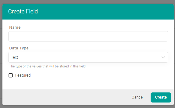 • Select the type of value the field can store in the Data Type selection. The accepted value types are: Text, Number, Date & Time, State, District, and Division