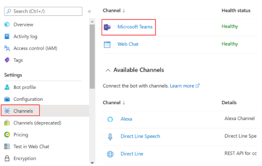 To add the Microsoft Teams channel to your bot