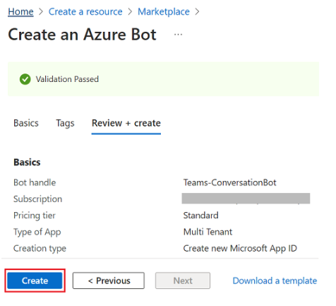 - Select Create, if validation is approved. It takes a few moments for your bot service to be provisioned.
