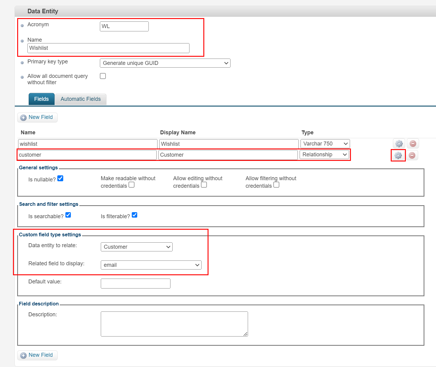 For example, assume your store has a Customer entity and a Wishlist entity. If you want each customer to be able to create multiple wishlists, you must create a field in the Wishlist entity to link each one of them to a customer.