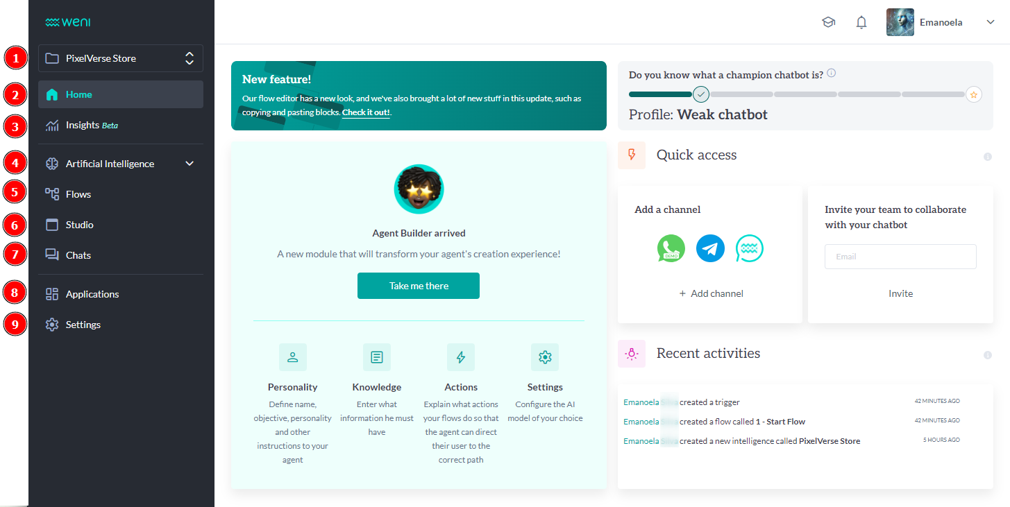 1. Learning Center: Here you will find learning resources related to the Weni Platform.