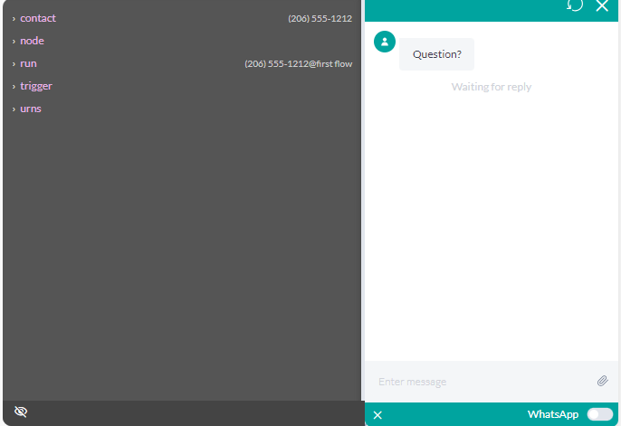 Now, you can send messages as a response to your flow using the text bar (1), restart the simulation anytime by using the simulator's restart button (2), send attachments like photos, audio, and videos using the attachments button (3), enable WhatsApp mode (4), and end the use of the simulator whenever you wish (5). If you want a more complete version of the simulator, just press the @ (5) button that will transform the simulator to this new mode: