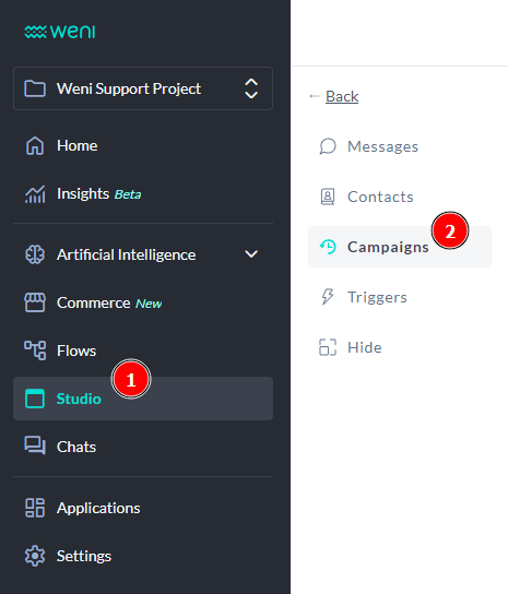 • Go to the ""Campaigns"" option in the ""Studio"" module on the side menu