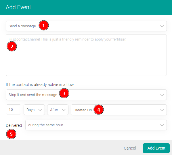 1. In ""Delivered"": This can be used for schedules over 24 hours. Here, you can specify whether people receive the message at the exact time of the event or if you want to standardize all messages to be sent together at a specific time of day.