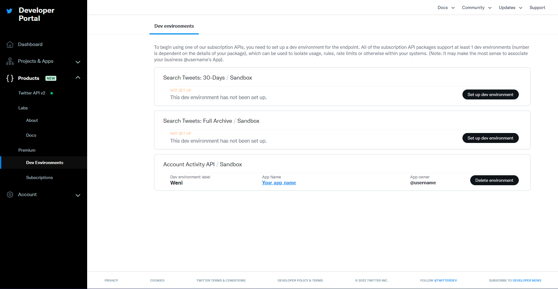 2. Next, you will need to create a development environment for your application to run. You will want to create an environment for the ""Account Activity API / Sandbox"". You can name it however you want, we recommend ""production"", be sure to select the application you created in the step