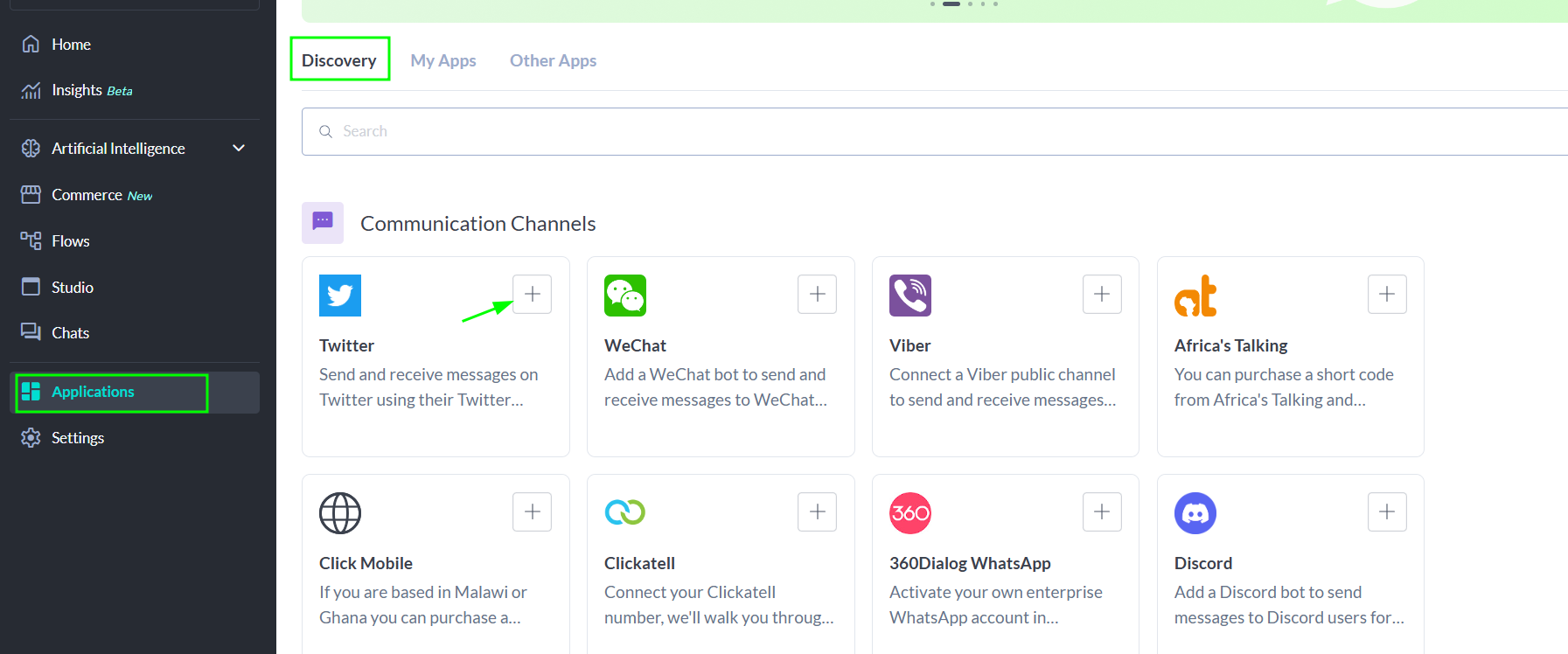 1. To create the channel on the platform, go to your project, enter Applications > Discovery in the Communication Channels section, and add it by clicking the ""+"".