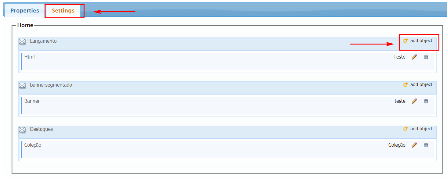 In the example below, we will define a shop window shown on the Home page. Therefore, select Settings, then add object, as in the following image.