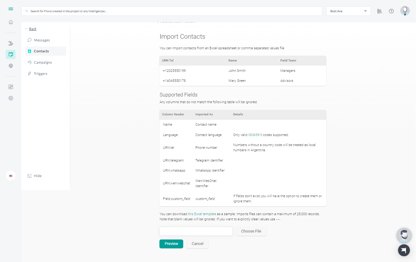 • URN: : column with the URN of the channel that the contact will communicate, remembering, that the contact is only valid if it has at least one URN.