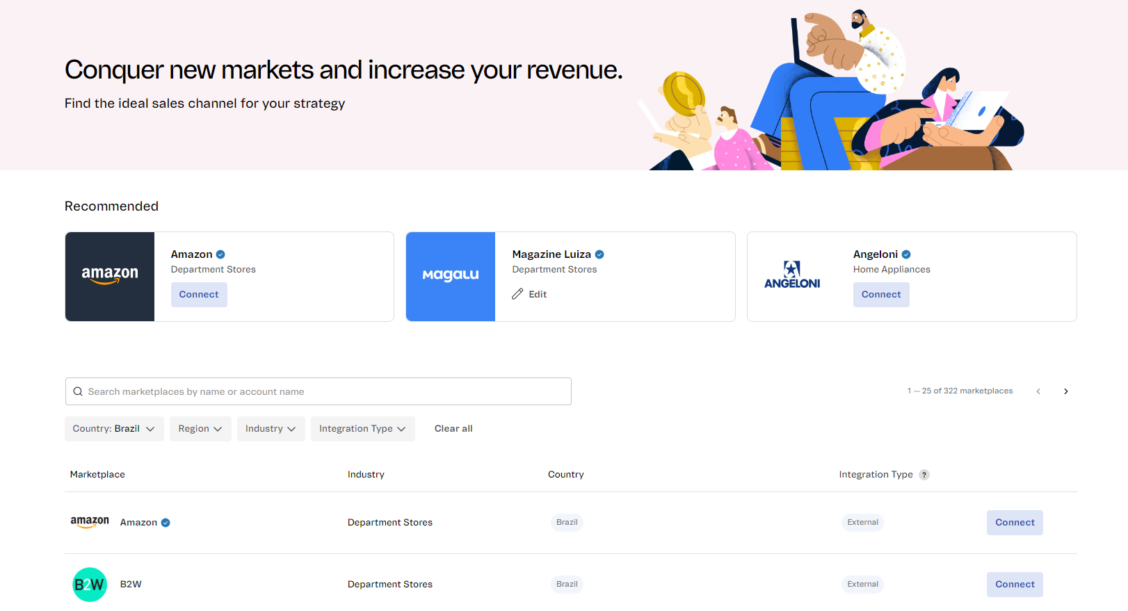 The Marketplaces and Integrations page facilitates the connection and communication between marketplaces and sellers within the VTEX ecosystem, enabling new business and mutual growth for all involved. The page works as a catalog of companies interested in partnerships, allowing registration, search, and contact between marketplaces and sellers to sign their commercial agreements.