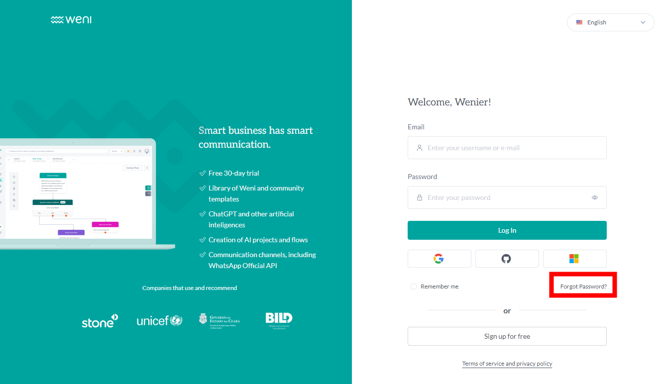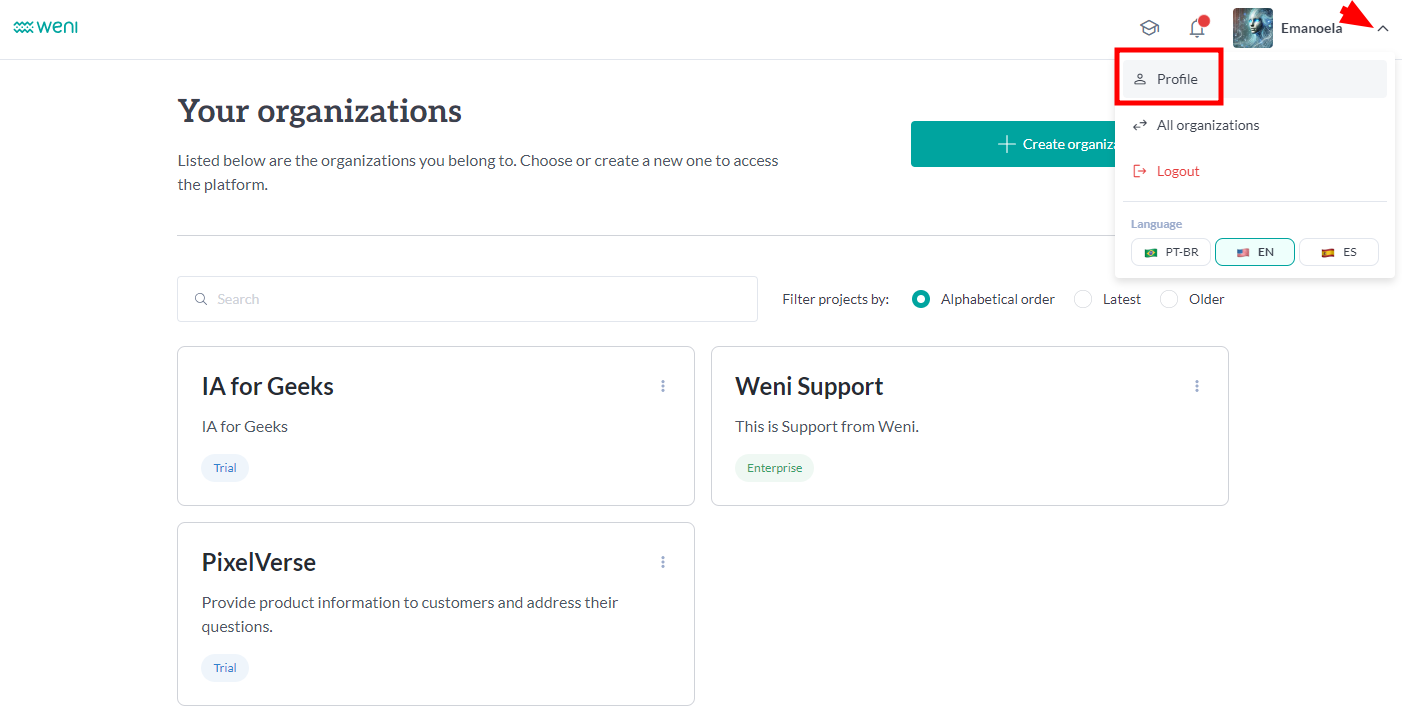 As a community, Weni is built by its users and collaborators! Therefore, the Profile section allows you to manage your account and view all your intelligences.