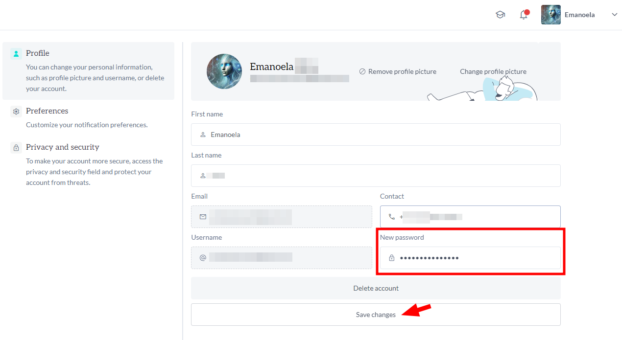 By clicking the icon on the left, select Profile. In this section, you can edit your first name, last name, and contact information, as well as change your password if necessary. You can also upload a profile picture. Enter your changes and click Save Changes, and the information will be updated.