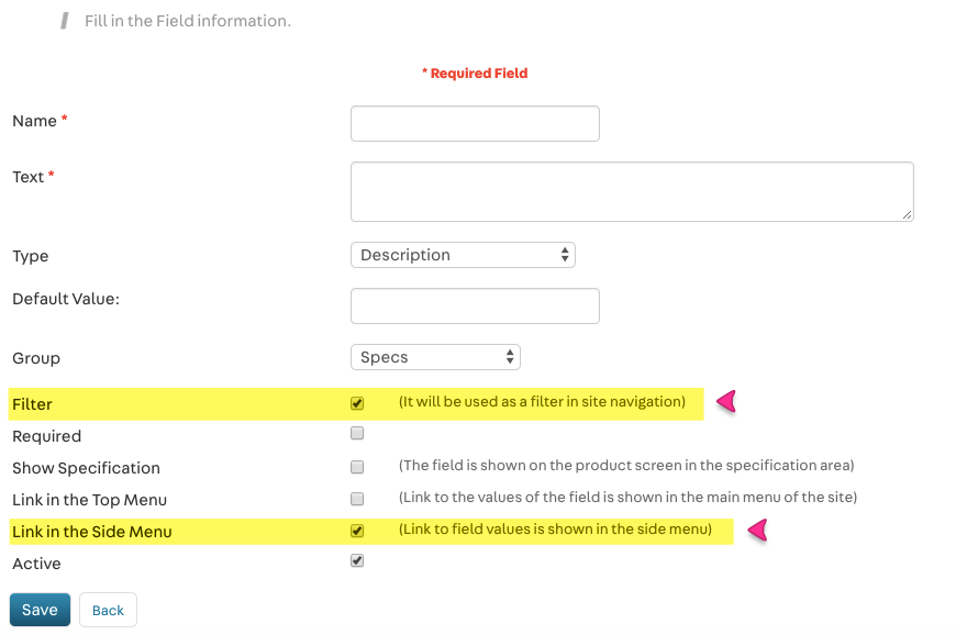 For a product field or SKU field to be displayed on the menu by the Search Navigator control, it must have two flags tagged: