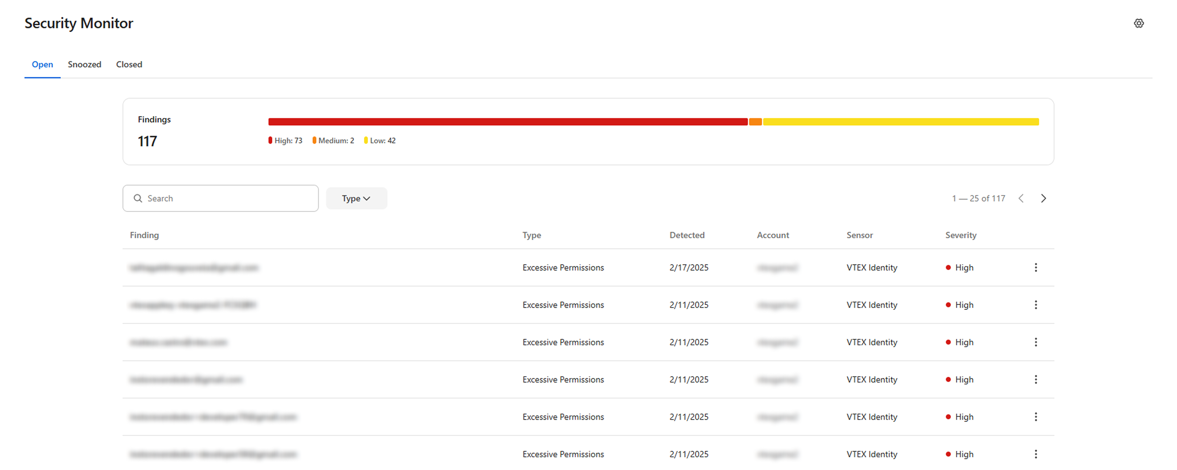 The Open tab displays the threats detected by the Security Monitor that have not yet been managed or snoozed.