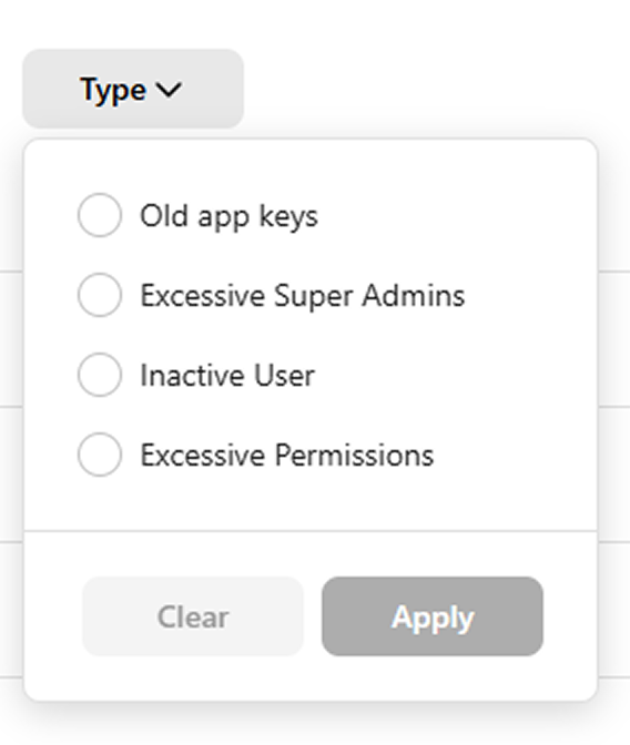• Excessive Super Admins: Users or API keys with the Owner (Admin Super) role.