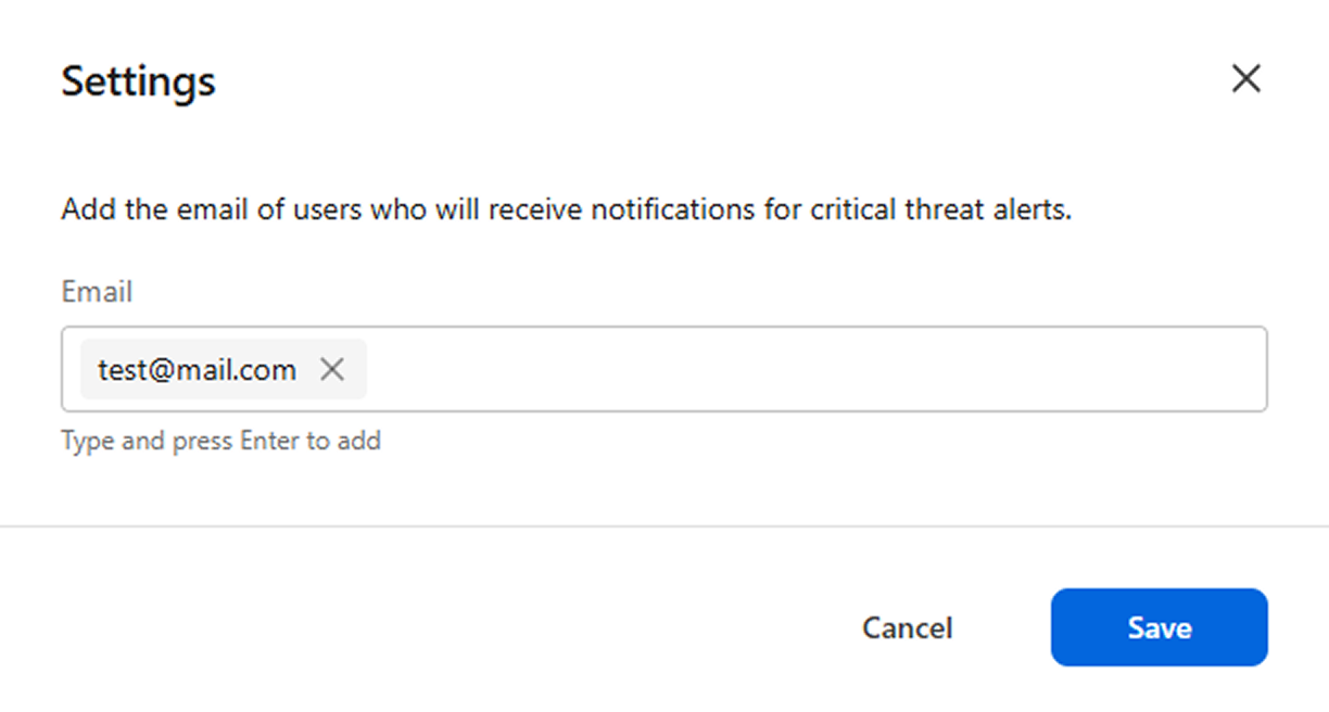 2. Enter the email address of the user that will receive notifications and press Enter. Repeat this step for as many users as you want.