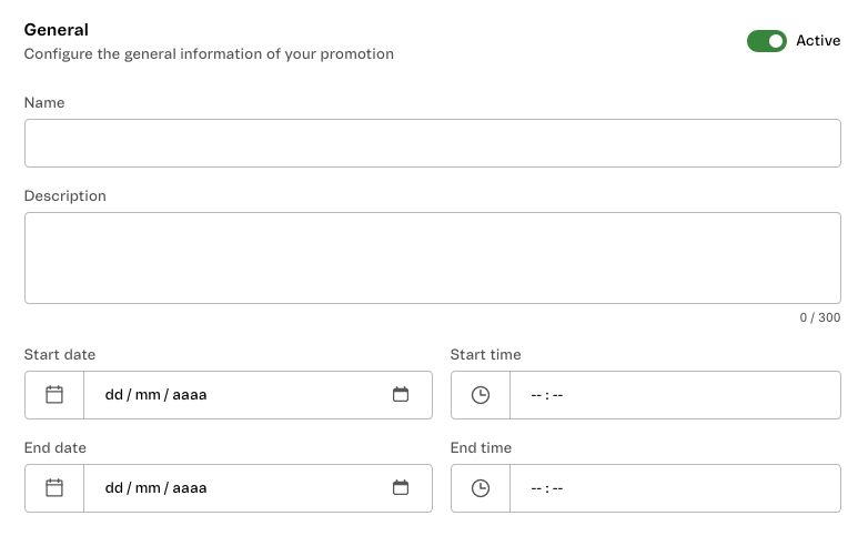• End date: End date of the promotion. As long as the end date is valid, the promotion will maintain its active status. Once the end date is reached, the discount will be automatically deactivated.