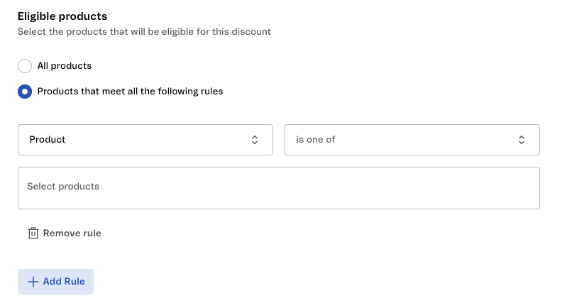 To add more than one selection rule, click + Add Rule. If more than one rule is configured, only items that meet both rules will have the discount applied.