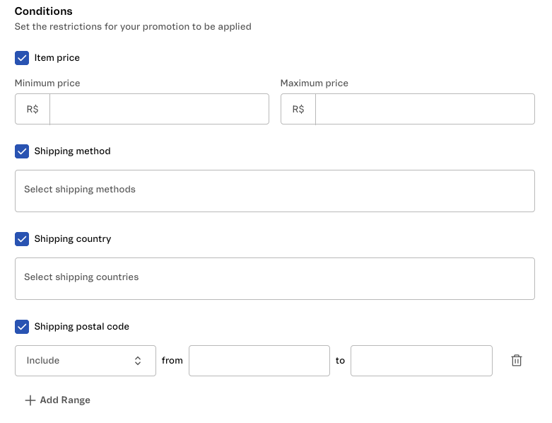 • Shipping method: The discount will apply only if the customer selects the same shipping method specified in the promotion.