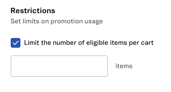 • Limit the number of eligible items per cart: Defines the maximum number of items in the cart that will be affected by the promotion. If the cart has more items than the limit, the discount will only be applied to the number of items configured in this field.