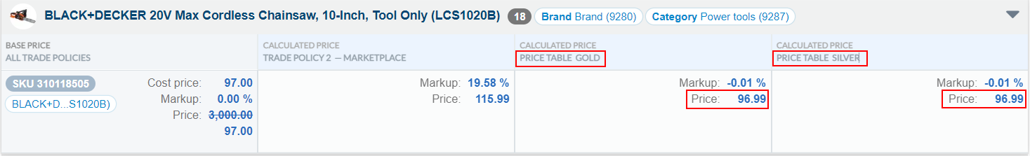 Once you have created your price tables, you can see the price of each product in the store separated by price table, in the same way as with trade policies.