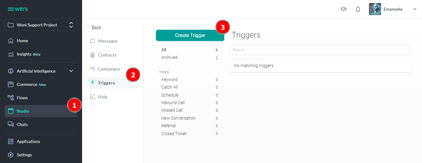 All steps described here will be performed on the ""Triggers"" tab, located within the ""Studio"" module.
