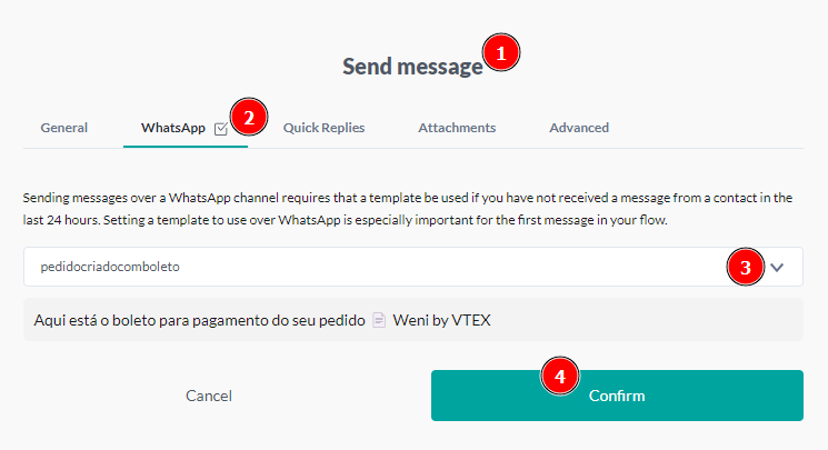 Your registered templates should appear. Select the desired one and insert the variable if applicable, click OK and finalize your flow.