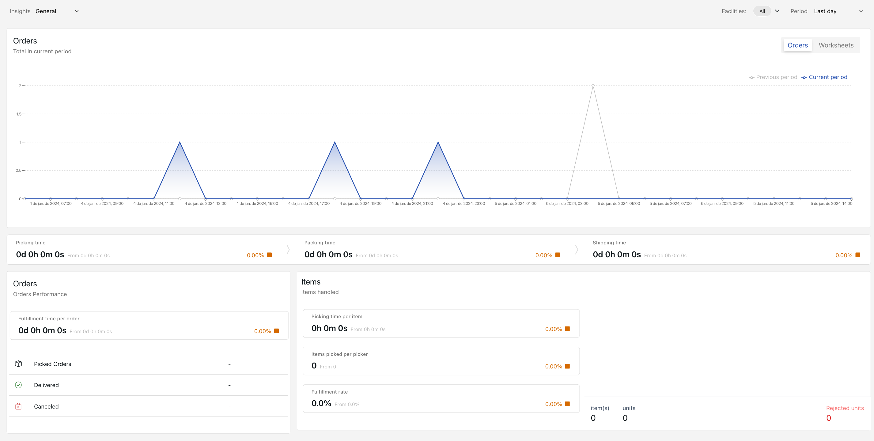 In this section, you will see information about the order items managed in VTEX Pick and Pack, the average picking time per item, the number of items picked by picker, and the order fulfillment rate.