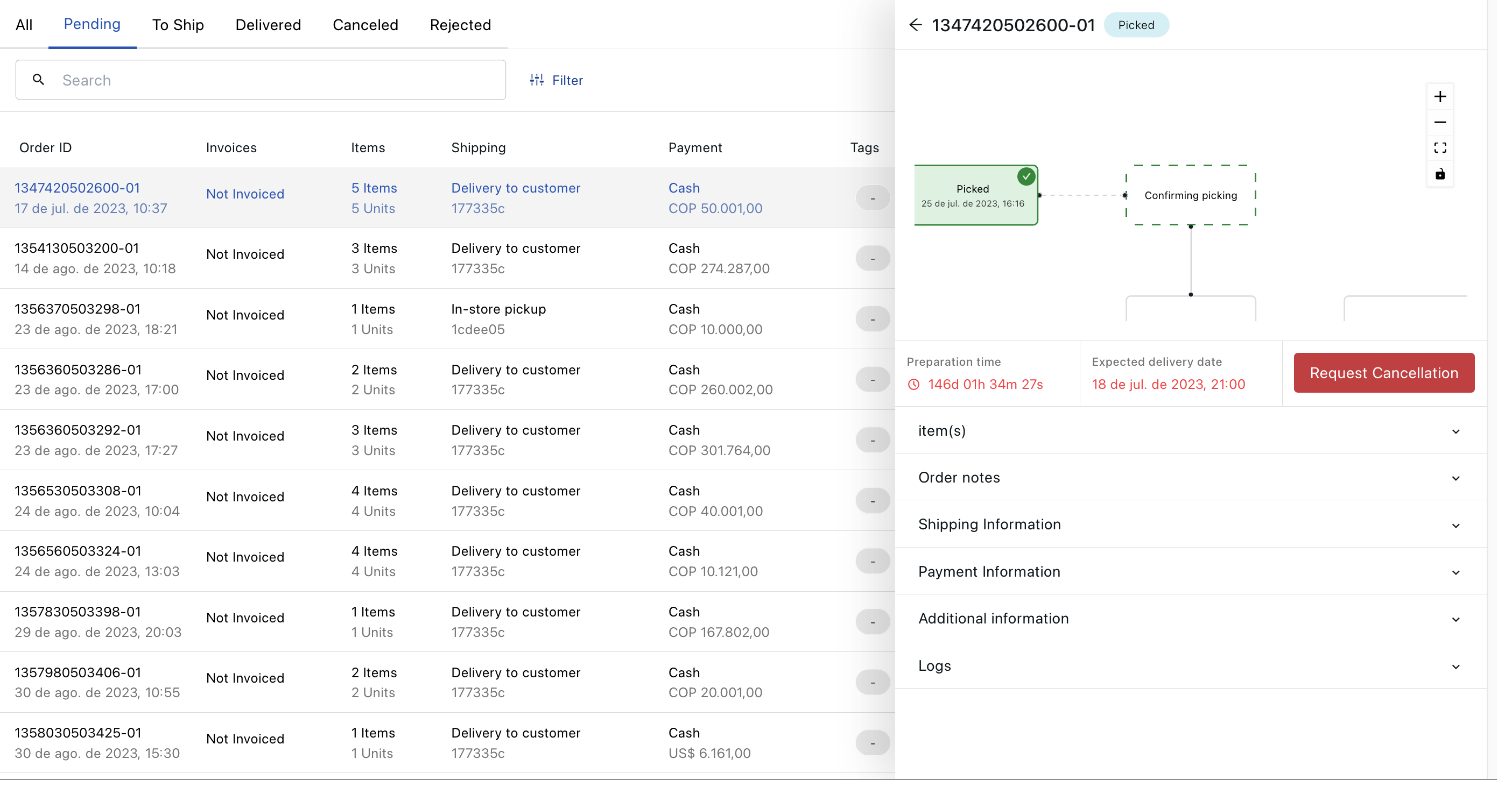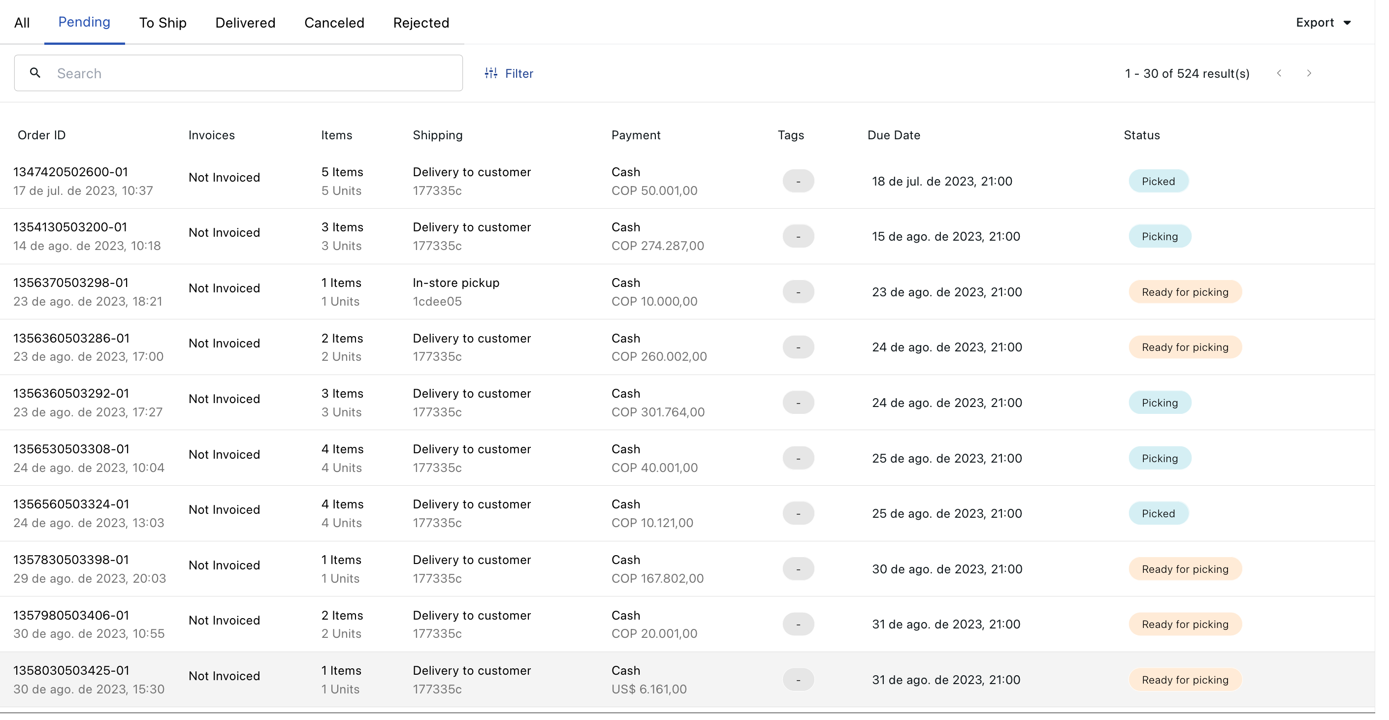 - Pending: Orders that are pending, ready for picking and were picked.