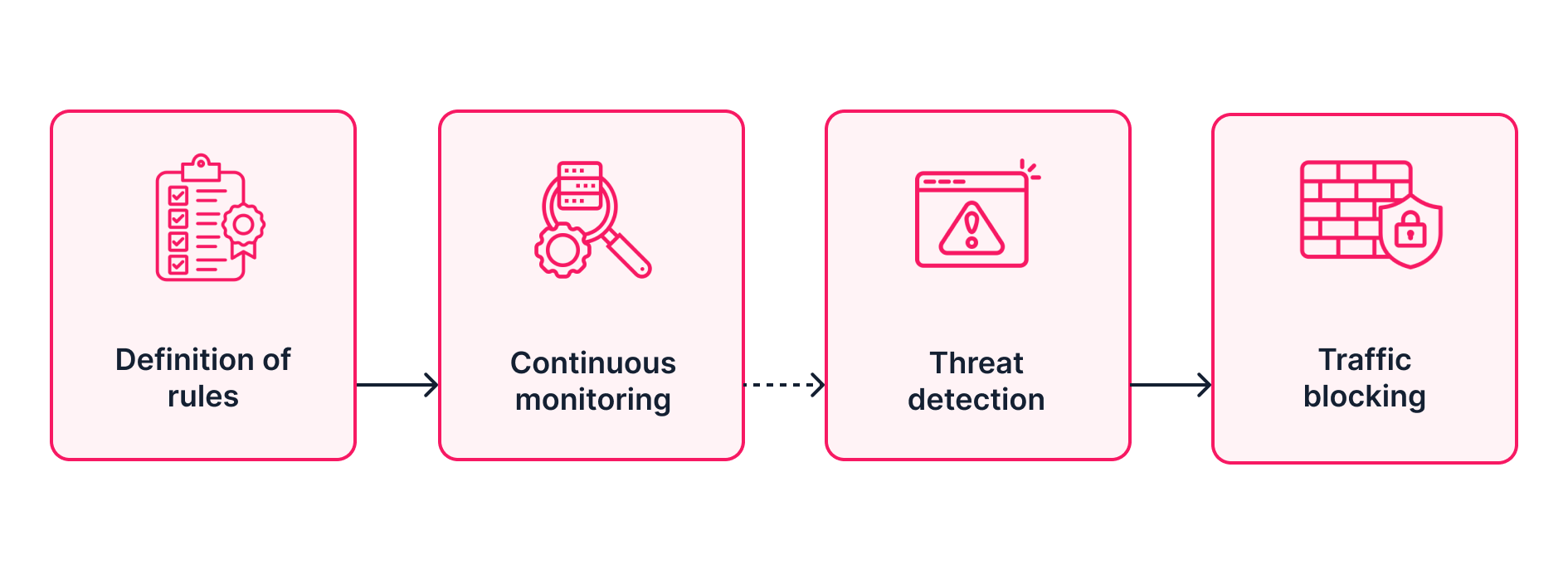 The WAF's operation begins with the VTEX Security team defining security rules based on the analysis of information flow patterns. Based on these rules, the WAF continuously monitors web traffic. When it detects potentially harmful activity, it can block the traffic, thus preventing vulnerabilities in the web application.