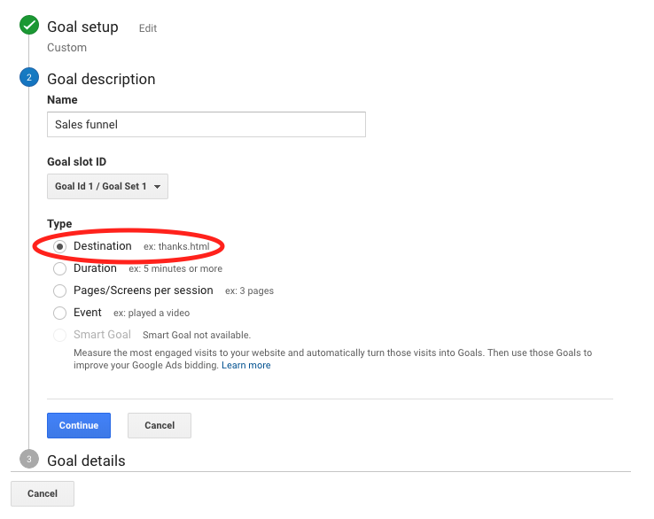 In step 2 you can define the name you prefer for your goal and a position code (for internal Google Analytics use). In type, let's use "Destination":