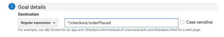 In the "Destination" field select the regular expression option and enter the URL of the order placed page: ^/checkout/orderPlaced