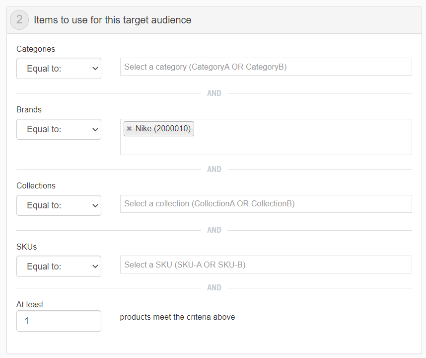 For example: The target audience includes items whose brand is Nike, as illustrated below. The configuration also indicates that at least 3 items must meet the criteria. Therefore, a customer must have at least 3 items in the shopping cart to be included in the target audience.