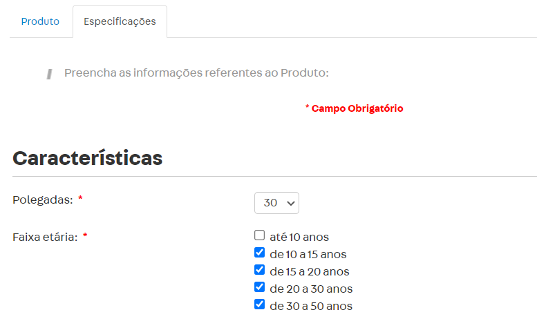 • Obrigatório: define se o valor obrigatoriamente precisa ser preenchido no cadastro do produto ou não. Caso o campo seja obrigatório, o produto só poderá ser ativado após o preenchimento desta especificação.
