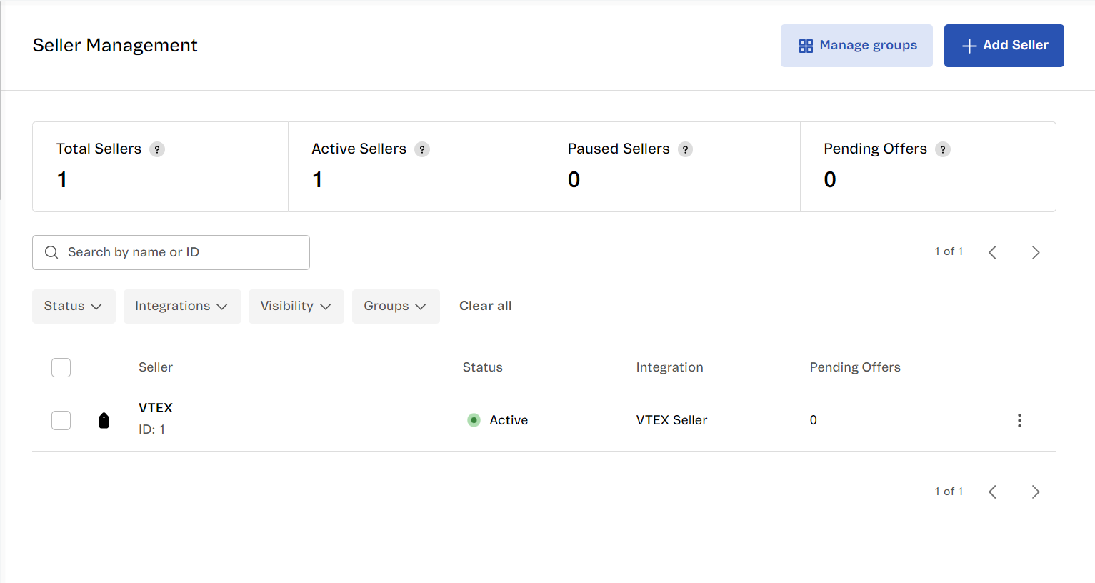 The list has a column with the sellers' names and IDs, and it can be filtered it by status, integration, and active offers. By clicking on a seller, you will be redirected to the Seller details page, where you can view and edit their basic information.