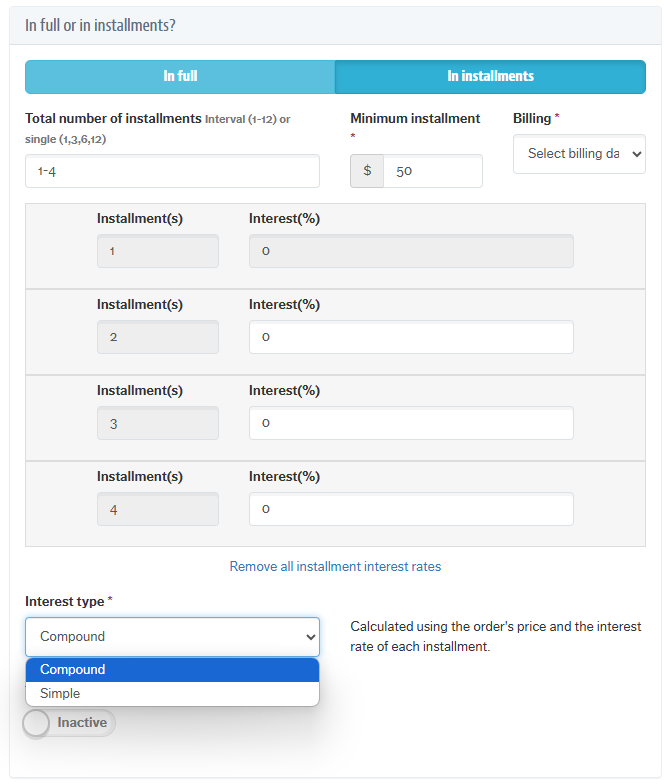 11. The Billing field will only be taken into account for installments with interest, so any option is valid.