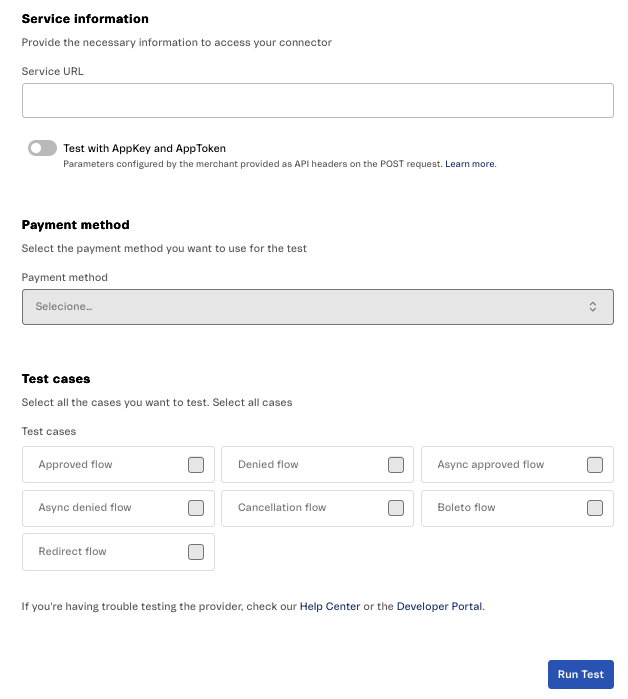 After completing the Service URL field, Test Suite will validate the Manifest endpoint and check the declared payment methods. They will be displayed as options in this field. Select the payment method you want to test.