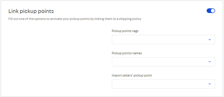 > ℹ️ For stores that have more than 50 pick points, we recommend using the Pickup Point Tags field when creating a pick point. Using tags makes it easier to find the pickup points when linking them to the shipping policy. Also remember that the shipping policy that is linked to a pickup point will not be available for any other shipping method. We recommend creating a shipping policy that is exclusive to the pickup point.