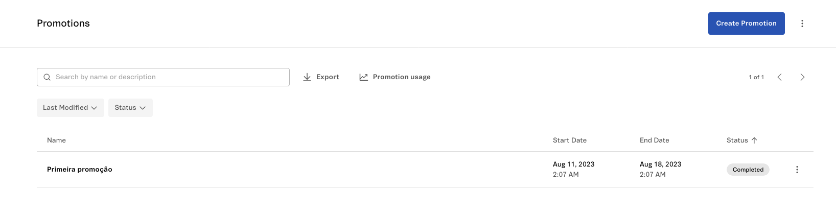 You can download a CSV file with the promotions available in your store and their respective information. To do this, click the Export button next to the search bar. The file content will be exported considering applied filters and does not include archived promotions.