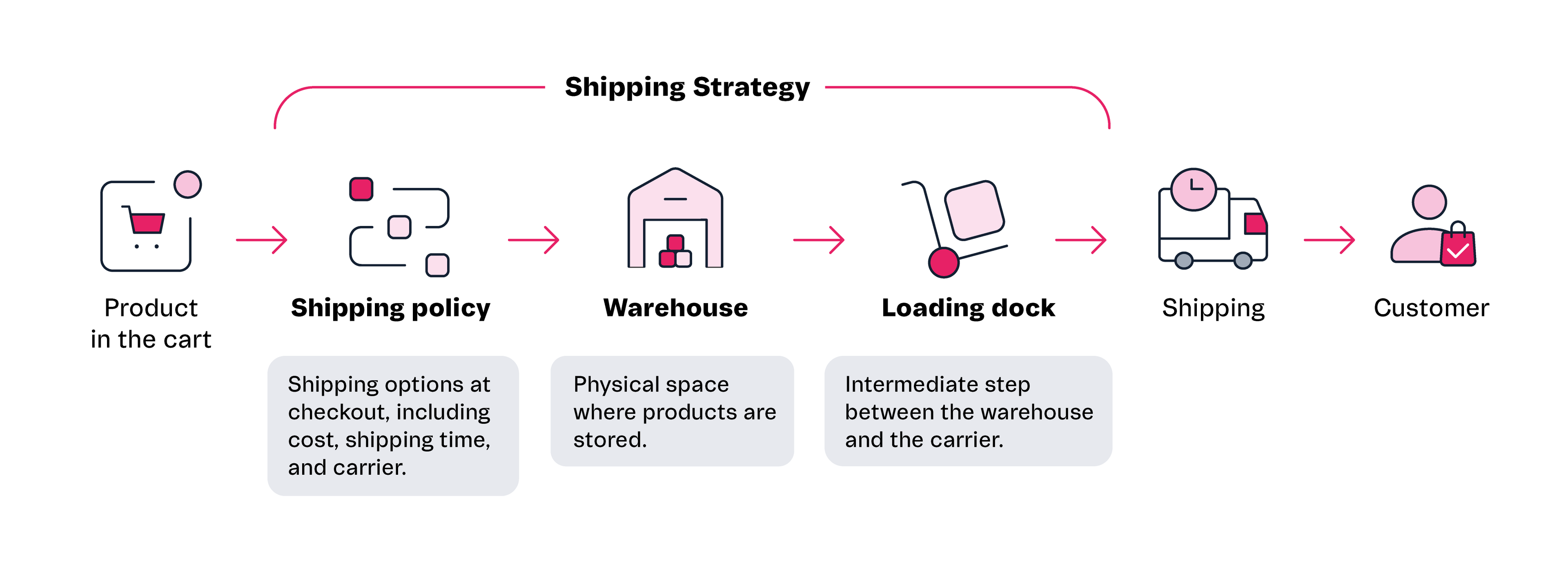 The shipping strategy refers to the relationship between inventory, loading dock and shipping policy. The way they communicate will define the structure combination for shipping your customers’ orders.