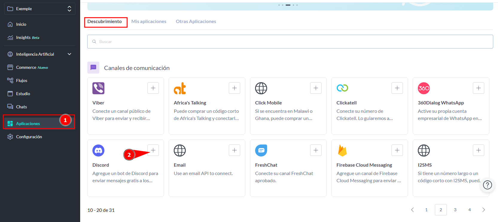 - Dentro del proyecto, ve a: Aplicaciones -> Descubrimiento -> Agregar Discord.