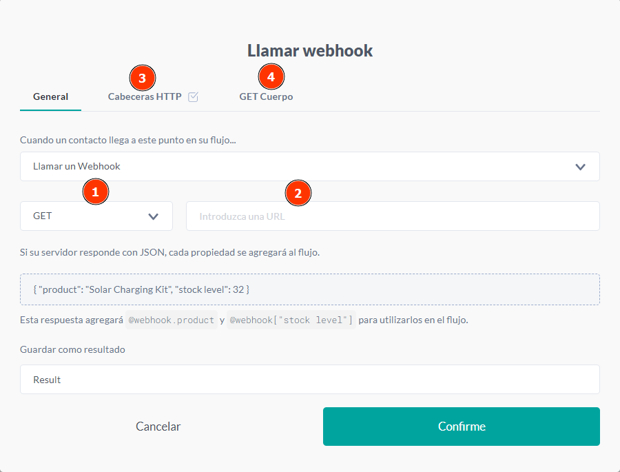 • @webhook.results.0.cliente: Nombre del cliente devuelto por la API. Si la respuesta está en un array, es necesario especificar la posición deseada en el array, como 0, 1, 2, y así sucesivamente.