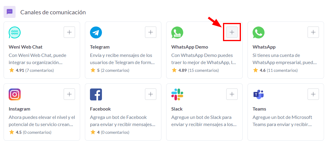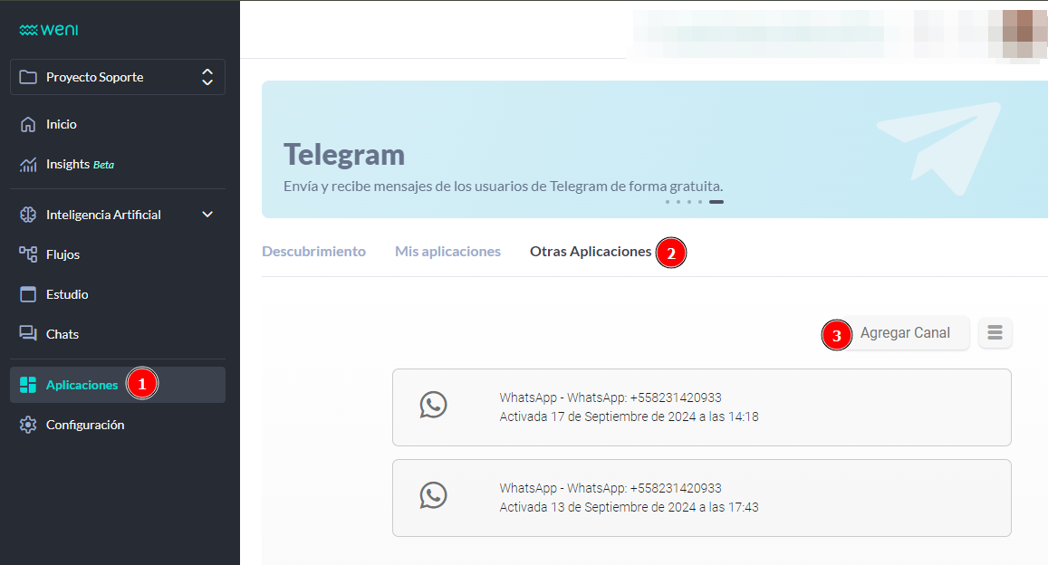1. Dentro de Aplicaciones encontrarás un menú con los canales compatibles con la Plataforma Weni.
