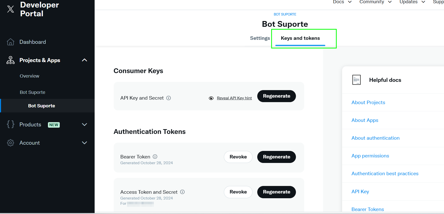 - Ahora necesitas crear las claves y tokens para tu aplicación, que serán necesarios al crear tu canal. Vuelve a tu aplicación y selecciona la pestaña Keys and****Tokens. Haz clic en Regenerar en las secciones Consumer API Keys y Access token & access token secret. Las claves y tokens deben generarse con los permisos de ""Leer, Escribir y Mensajes Directos"".