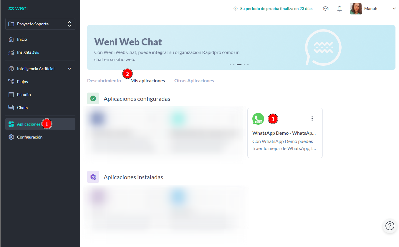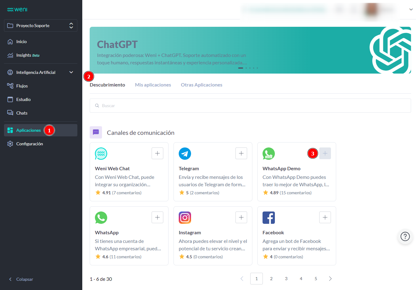 1. En tu proyecto, haz clic en Aplicaciones > Descubrimientos > Añade WhatsApp Demo.