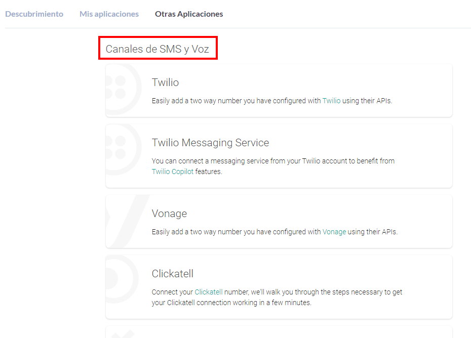 Después de elegir tu canal SMS, sigue el paso a paso para realizar esta integración. Aquí tenemos los canales SMS disponibles en el proyecto.