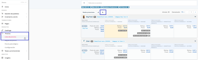 Para incluir metadatos al exportar una plantilla de precios de SKUs, siga los siguientes pasos: