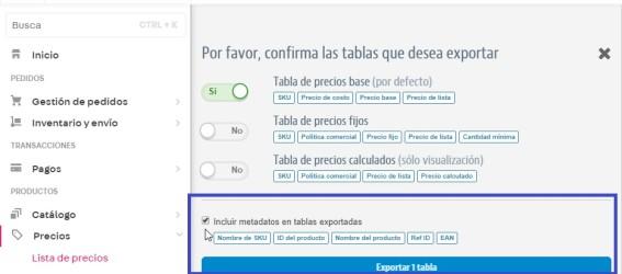Cómo incluir metadatos al exportar plantilla de precios