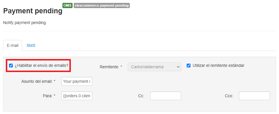 Como ejemplo, utilizaremos el paso a paso de cómo deshabilitar el correo electrónico de boletos de pago pendiente. En este caso, el correo electrónico se envía 48 horas después de finalizar la solicitud. Es importante recordar que no hay posibilidad de personalizar este intervalo de tiempo.